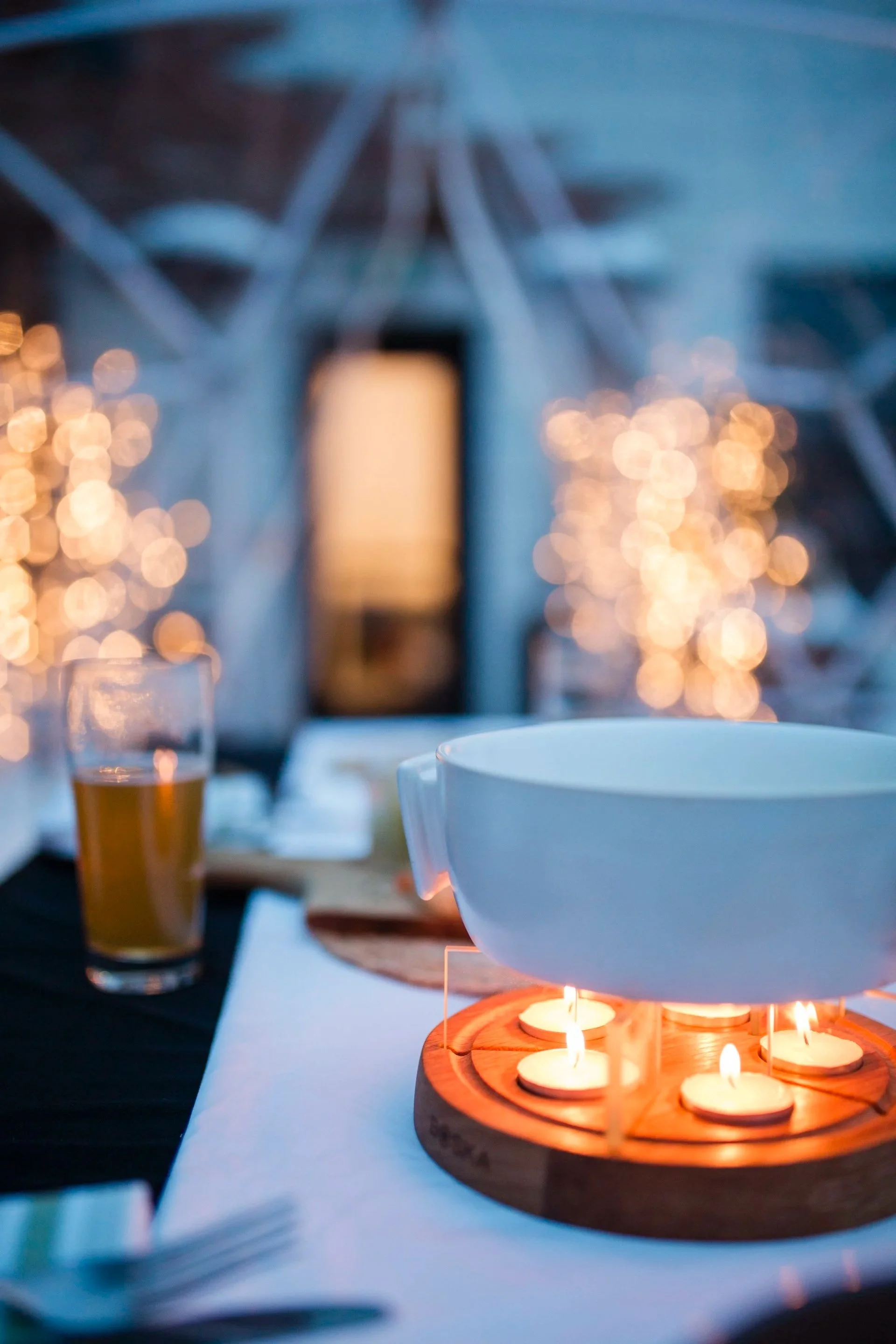 Our rooftop dome is heated and cozy but this is an outdoor winter experience. Your server will open the door to come in and out during the experience and you will need to walk roughly 5 metres from the patio door to the dome. You will also have access to our rooftop fireplace which is great - but exposed. Dress in layers & bring a jacket.
